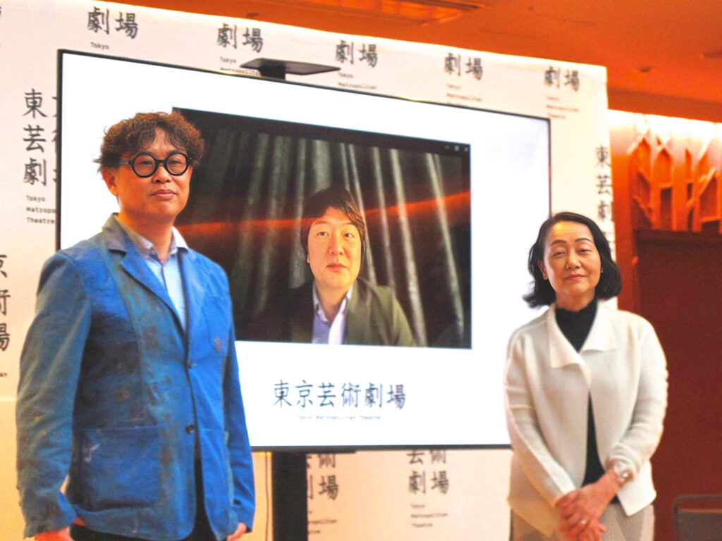 岡田利規芸術監督、鈴木順子副館長 とスクリーン内(モナコからオンライン参加)は音楽部門芸術監督山田和樹